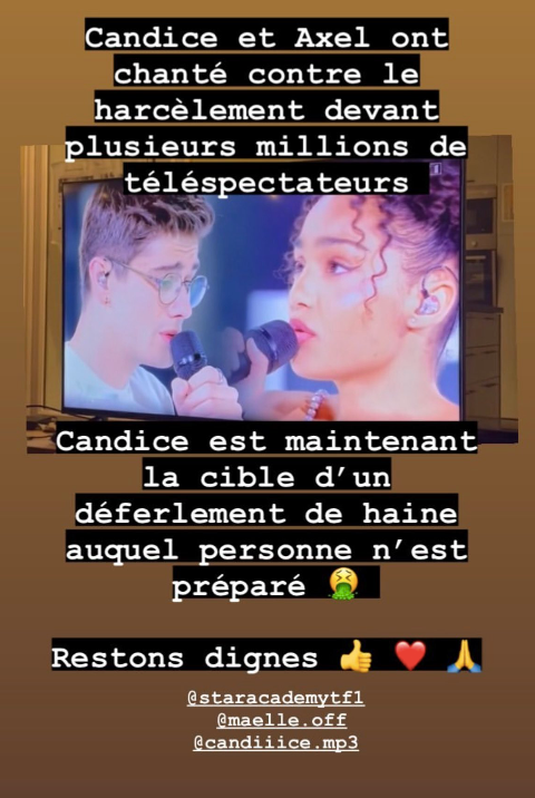 Face aux nombreux commentaires haineux ciblant sa fille, le père de l’académicienne a décidé de réagir. « Candice et Axel ont chanté contre le harcèlement devant plusieurs millions de téléspectateurs. Candice maintenant la cible d’un déferlement de haine auquel personne n’est préparé. Restons dignes », a-t-il posté via sa story Instagram. Un message qui apaisera on espère les tensions…
